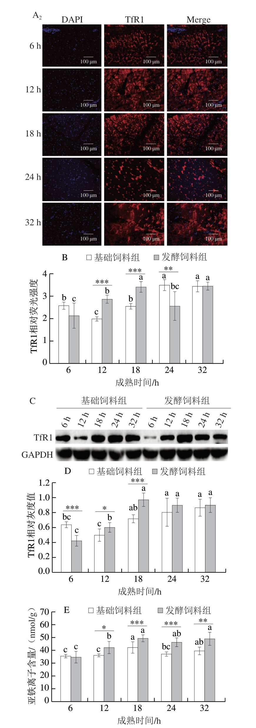 A.TfR1免疫荧光染色图;下标1.基础饲料组,下标2.发酵饲料组,图2A同;B. TfR1免疫荧光染色图荧光强度分析;C、D.分别为TfR1蛋白免疫印迹图及其灰度值分析;E.亚铁离子含量。小写字母不同表示不同成熟时间之间差异显著(P<0.05);*.组间差异显著(P<0.05);**.组间差异极显著(P<0.01);***.组间差异高度显著(P<0.001);图2~4同。