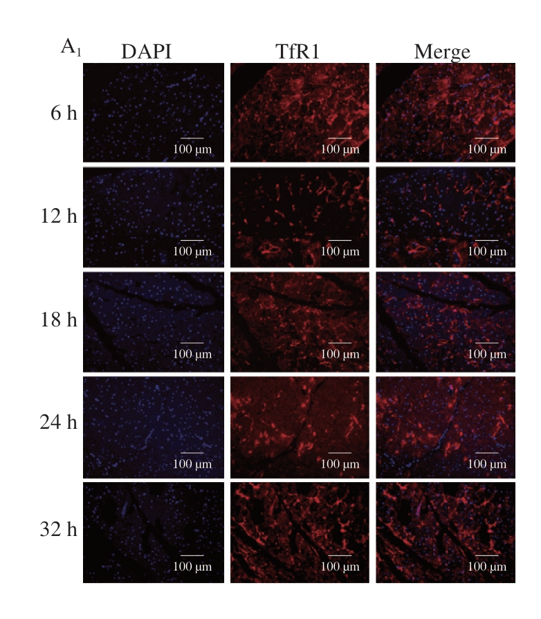取0.8 cm×0.8 cm×1.2 cm的长方体鸡胸肉样品,采用环保型GD肌肉固定液固定24 h以上。固定完成后,修剪平整,依次脱水、浸蜡、石蜡包埋,制作切片。石蜡切片脱蜡漂洗后,采用乙二胺四乙酸(ethylenediaminetetraacetic acid,EDTA)抗原修复缓冲液(pH 8.0)进行抗原修复,随后以磷酸盐缓冲液(phosphate buffer saline,PBS)(pH 7.4)漂洗。使用组化笔标记目标区域,向标记目标区域内滴加牛血清白蛋白封闭30 min。一抗为抗TfR1小鼠单克隆抗体,以1∶500稀释,4 ℃孵育过夜;二抗为HRP标记山羊抗小鼠IgG,以1∶500稀释,室温孵育50 min。PBS漂洗后,以4’,6-二脒基-2-苯基吲哚(4’,6-diamidino-2-phenylindole,DAPI)复染细胞核,猝灭组织自发荧光。最后,采用抗荧光猝灭封片剂封片,荧光显微镜拍照,阳性信号呈红色荧光。