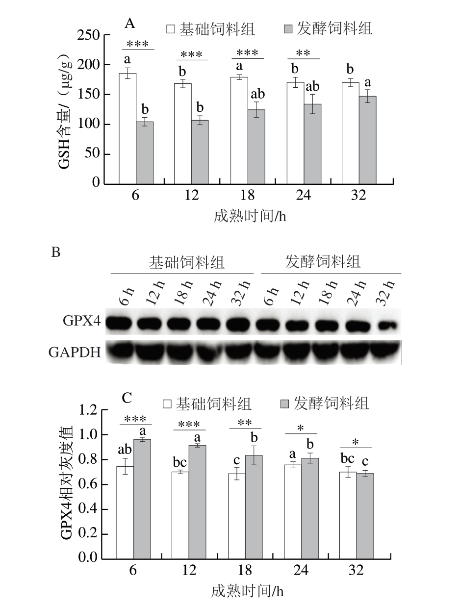 GSH代谢途径的抑制已被证实是诱发铁死亡的关键机制,而GSH/GPX4信号轴作为该途径的核心调控环节发挥着重要作用[24]。由图3A可知,基础饲料组GSH含量随成熟时间的延长呈现显著下降趋势(P<0.05),相反,发酵饲料组GSH含量呈显著上升趋势(P<0.05),但在成熟32 h前,其GSH含量始终显著低于基础饲料组(P<0.01、P<0.001)。这可能源于发酵饲料中特定成分对GSH合成酶系的抑制作用,导致细胞内GSH的生物利用度受限,间接产生类似GPX4功能抑制的效果。
