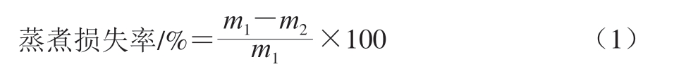 将在4 ℃成熟的鸡肉块取出并擦干表面汁液,称质量(m1/g),85 ℃水浴加热至肉块中心温度达75 ℃,待冷却至室温后擦干表面汁液,称质量(m2/g)。蒸煮损失率按式(1)计算[18]: