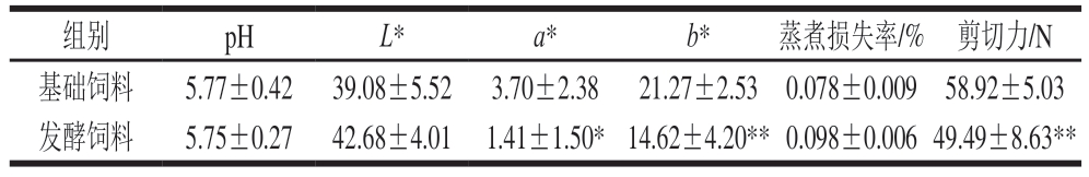 组别pHL*a*b*蒸煮损失率/%剪切力/N基础饲料5.77±0.4239.08±5.523.70±2.3821.27±2.530.078±0.00958.92±5.03发酵饲料5.75±0.2742.68±4.011.41±1.50*14.62±4.20**0.098±0.00649.49±8.63**