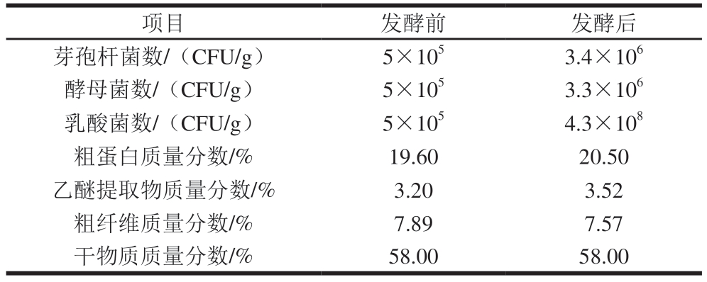 项目发酵前发酵后芽孢杆菌数/(CFU/g)5×1053.4×106酵母菌数/(CFU/g)5×1053.3×106乳酸菌数/(CFU/g)5×1054.3×108粗蛋白质量分数/%19.6020.50乙醚提取物质量分数/%3.203.52粗纤维质量分数/%7.897.57干物质质量分数/%58.0058.00