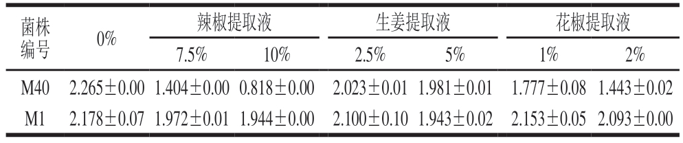 表8 菌株M1与M40在不同香辛料提取液下的生长情况(OD600 nm)