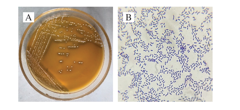 图4 菌落M1形态特征(A)及革兰氏染色结果(B)