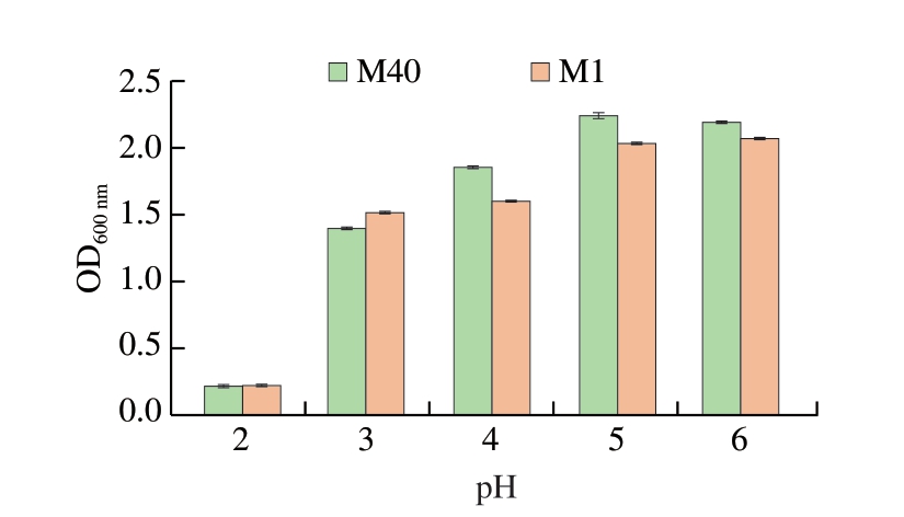 图3 菌株M1与M40在不同pH值下的生长情况