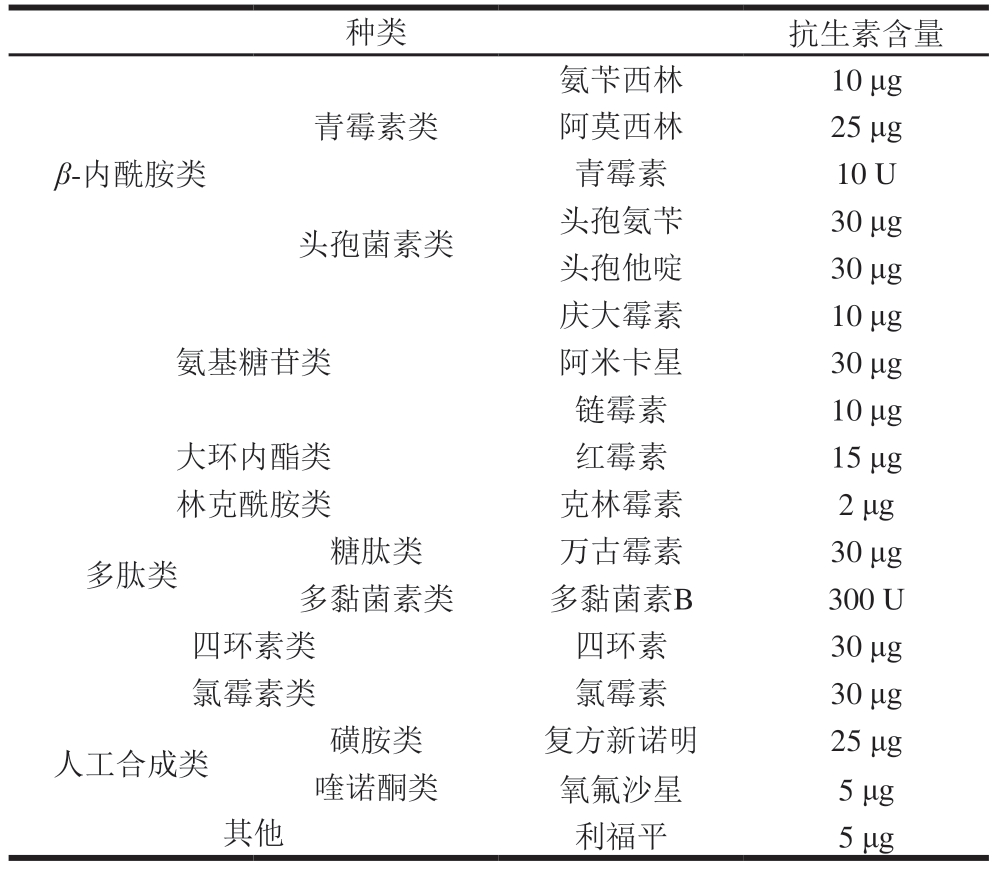 表2 抗生素药敏纸片种类及含量