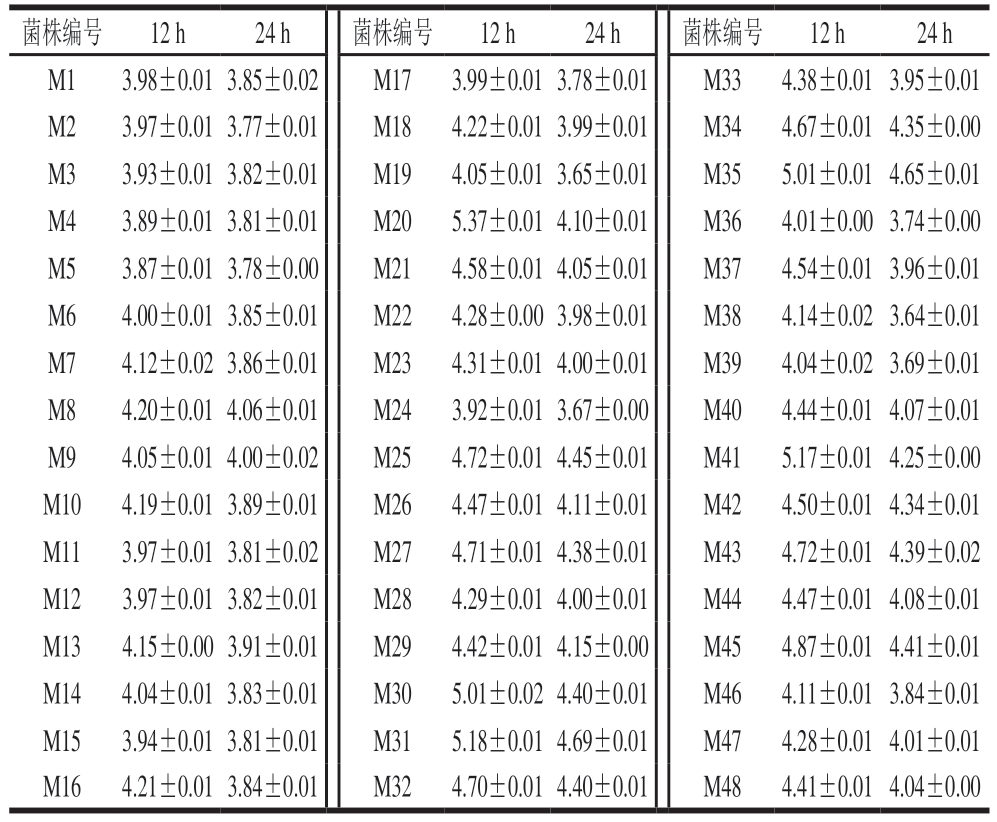 菌株产酸能力是影响酸肉发酵品质与安全性的关键指标,作为肉制品发酵菌,要求乳酸菌在24 h内迅速产酸,培养液pH值降至5.0以下[29]。如表3所示,初筛出的48 株乳酸菌均表现出良好的产酸特性:培养24 h时培养液pH值均低于培养12 h时,且培养24 h时培养液pH值均降至5.0以下。48 株乳酸菌均满足产酸能力要求。这一结果充分证实初筛菌株具备作为发酵剂的功能基础,为后续基于多维度评价指标的筛选工作提供可靠保障。