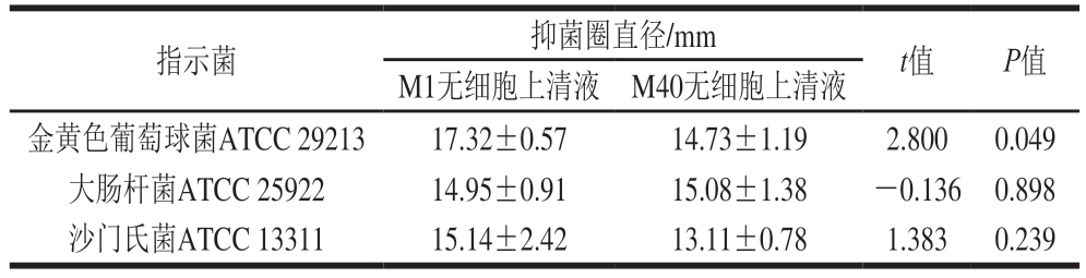 指示菌抑菌圈直径/mmt值P值M1无细胞上清液M40无细胞上清液金黄色葡萄球菌ATCC 2921317.32±0.5714.73±1.192.8000.049大肠杆菌ATCC 2592214.95±0.9115.08±1.38-0.1360.898沙门氏菌ATCC 1331115.14±2.4213.11±0.781.3830.239