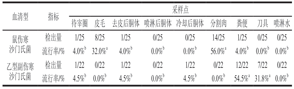血清型指标采样点待宰圈皮毛去皮后胴体喷淋后胴体冷却后胴体分割肉粪便刀具喷淋水鼠伤寒沙门氏菌检出量1/258/251/250/250/2514/251/250/250/25流行率/%4.0%b32.0%a4.0%b0.0%b0.0%b56.0%a4.0%b0.0%b0.0%b乙型副伤寒沙门氏菌检出量1/220/221/220/221/220/2212/227/220/22流行率/%4.5%b0.0%b4.5%b0.0%b4.5%b0.0%b54.5%a31.8%a0.0%b