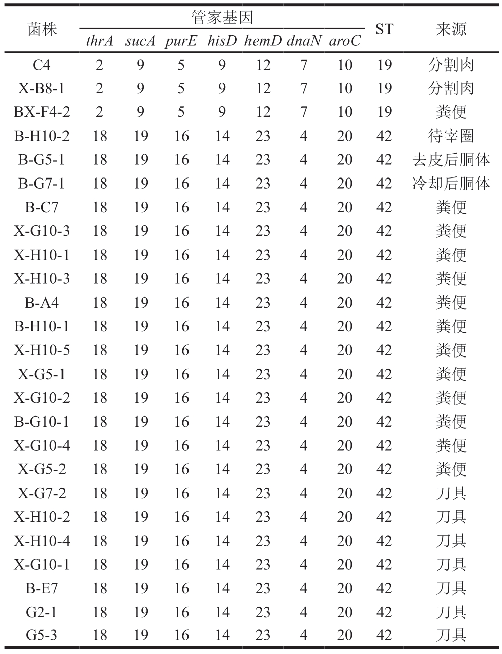 菌株管家基因ST来源thrAsucApurEhisDhemDdnaNaroC C429591271019分割肉X-B8-129591271019分割肉BX-F4-229591271019粪便B-H10-2181916142342042待宰圈B-G5-1181916142342042去皮后胴体B-G7-1181916142342042冷却后胴体B-C7181916142342042粪便X-G10-3181916142342042粪便X-H10-1181916142342042粪便X-H10-3181916142342042粪便B-A4181916142342042粪便B-H10-1181916142342042粪便X-H10-5181916142342042粪便X-G5-1181916142342042粪便X-G10-2181916142342042粪便B-G10-1181916142342042粪便X-G10-4181916142342042粪便X-G5-2181916142342042粪便X-G7-2181916142342042刀具X-H10-2181916142342042刀具X-H10-4181916142342042刀具X-G10-1181916142342042刀具B-E7181916142342042刀具G2-1181916142342042刀具G5-3181916142342042刀具