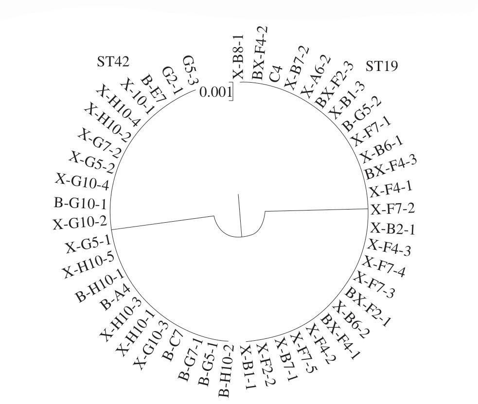 首先对沙门氏菌的7 个管家基因(thrA、sucA、purE、hisD、hemD、dnaN、aroC)进行PCR扩增,将PCR产物送至生工生物工程(上海)股份有限公司进行双向测序,对等位基因序列进行拼接和校正后提交至PubMLST数据库(https://pubmlst.org/),与数据库中沙门氏菌相应管家基因的等位基因进行比对,每个管家基因都有一个特有的等位基因序号,7 个管家基因的等位基因序号组成该菌株的等位基因谱。将分离菌株的等位基因谱提交至数据库,确定分离菌株的序列型(sequence typing,ST)。将每个分离株的等位基因串联序列信息导入MEGA X软件,进行系统发育分析。