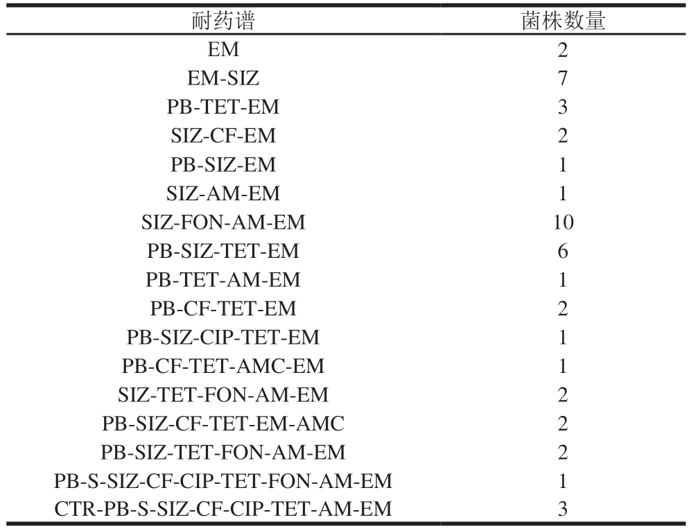 耐药谱菌株数量EM2 EM-SIZ7 PB-TET-EM3 SIZ-CF-EM2 PB-SIZ-EM1 SIZ-AM-EM1 SIZ-FON-AM-EM10 PB-SIZ-TET-EM6 PB-TET-AM-EM1 PB-CF-TET-EM2 PB-SIZ-CIP-TET-EM1 PB-CF-TET-AMC-EM1 SIZ-TET-FON-AM-EM2 PB-SIZ-CF-TET-EM-AMC2 PB-SIZ-TET-FON-AM-EM2 PB-S-SIZ-CF-CIP-TET-FON-AM-EM1 CTR-PB-S-SIZ-CF-CIP-TET-AM-EM3