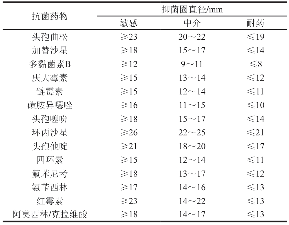抗菌药物抑菌圈直径/mm敏感中介耐药头孢曲松≥2320~22≤19加替沙星≥1815~17≤14多黏菌素B≥129~11≤8庆大霉素≥1513~14≤12链霉素≥1512~14≤11磺胺异噁唑≥1611~15≤10头孢噻吩≥1815~17≤14环丙沙星≥2622~25≤21头孢他啶≥2118~20≤17四环素≥1512~14≤11氟苯尼考≥1813~17≤12氨苄西林≥1714~16≤13红霉素≥2314~22≤13阿莫西林/克拉维酸≥1814~17≤13