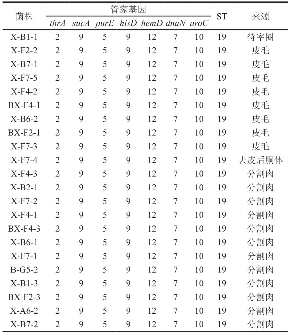 菌株管家基因ST来源thrAsucApurEhisDhemDdnaNaroC X-B1-129591271019待宰圈X-F2-229591271019皮毛X-B7-129591271019皮毛X-F7-529591271019皮毛X-F4-229591271019皮毛BX-F4-129591271019皮毛X-B6-229591271019皮毛BX-F2-129591271019皮毛X-F7-329591271019皮毛X-F7-429591271019去皮后胴体X-F4-329591271019分割肉X-B2-129591271019分割肉X-F7-229591271019分割肉X-F4-129591271019分割肉BX-F4-329591271019分割肉X-B6-129591271019分割肉X-F7-129591271019分割肉B-G5-229591271019分割肉X-B1-329591271019分割肉BX-F2-329591271019分割肉X-A6-229591271019分割肉X-B7-229591271019分割肉
