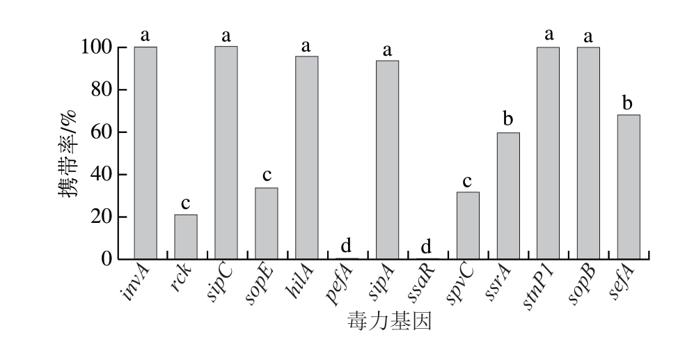 图1 肉牛屠宰工厂检出的沙门氏菌毒力基因携带率