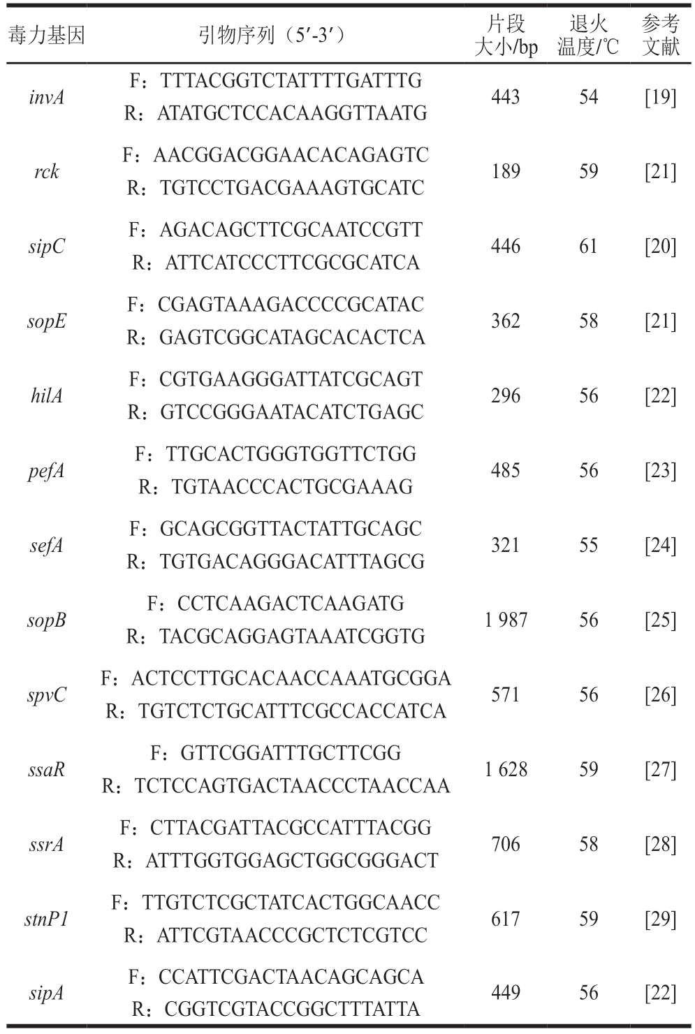 毒力基因引物序列(5’-3’)片段大小/bp参考文献invAF:TTTACGGTCTATTTTGATTTG44354[19]R:ATATGCTCCACAAGGTTAATG rckF:AACGGACGGAACACAGAGTC18959[21]R:TGTCCTGACGAAAGTGCATC sipCF:AGACAGCTTCGCAATCCGTT44661[20]R:ATTCATCCCTTCGCGCATCA sopEF:CGAGTAAAGACCCCGCATAC36258[21]R:GAGTCGGCATAGCACACTCA hilAF:CGTGAAGGGATTATCGCAGT29656[22]R:GTCCGGGAATACATCTGAGC pefAF:TTGCACTGGGTGGTTCTGG48556[23]R:TGTAACCCACTGCGAAAG sefAF:GCAGCGGTTACTATTGCAGC32155[24]R:TGTGACAGGGACATTTAGCG sopBF:CCTCAAGACTCAAGATG1 98756[25]R:TACGCAGGAGTAAATCGGTG spvCF:ACTCCTTGCACAACCAAATGCGGA57156[26]R:TGTCTCTGCATTTCGCCACCATCA ssaRF:GTTCGGATTTGCTTCGG1 62859[27]R:TCTCCAGTGACTAACCCTAACCAA ssrAF:CTTACGATTACGCCATTTACGG70658[28]R:ATTTGGTGGAGCTGGCGGGACT stnP1F:TTGTCTCGCTATCACTGGCAACC61759[29]R:ATTCGTAACCCGCTCTCGTCC sipAF:CCATTCGACTAACAGCAGCA44956[22]R:CGGTCGTACCGGCTTTATTA退火温度/℃