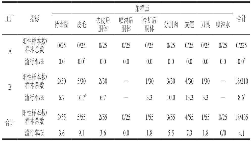 采样点工厂指标合计待宰圈皮毛去皮后胴体喷淋后胴体冷却后胴体分割肉粪便刀具喷淋水A阳性样本数/样本总数0/250/250/250/250/250/250/250/250/250/225流行率/%0.00.0b0.00.00.00.00.00.00.00.0b B阳性样本数/样本总数2/305/302/30-1/303/304/301/30-18/210流行率/%6.716.7a6.7-3.310.013.33.3-8.6a合计阳性样本数/样本总数2/555/552/550/251/553/554/551/550/2518/435流行率/%3.69.13.60.01.85.57.31.80/04.1