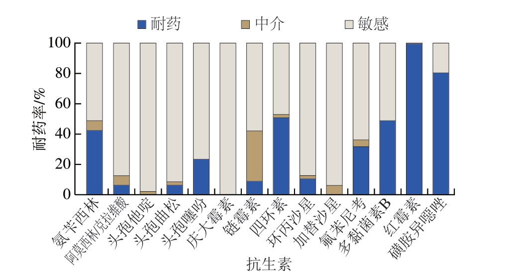 图2 肉牛屠宰工厂检出的沙门氏菌抗生素耐药率