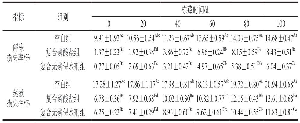 指标组别冻藏时间/d 020406080100解冻损失率/%空白组9.91±0.92Ac10.56±0.54Abc11.23±0.67Ab13.65±0.59Aa14.03±0.75Aa14.68±0.47Aa复合磷酸盐组1.37±0.23Bd1.92±0.38Bd3.86±0.72Bc6.96±0.24Bb8.15±0.59Ba8.43±0.51Ba复合无磷保水剂组0.77±0.05Bd2.69±0.63Bc3.21±0.42Bc4.97±0.65Cb5.38±0.51Cab6.04±0.37Ca蒸煮损失率/%空白组17.28±1.27Ac17.86±1.17Ac17.98±0.81Ab18.13±0.57Aab19.72±0.80Aa20.94±0.68Aa复合磷酸盐组6.78±0.36Be7.92±0.68Bd10.02±0.30Bc10.82±0.77Bc12.15±0.43Bb13.61±0.68Ba复合无磷保水剂组6.25±0.22Be7.41±0.29Bd8.93±0.60Bc9.62±0.61Bbc10.44±0.55Cb11.83±0.81Ca
