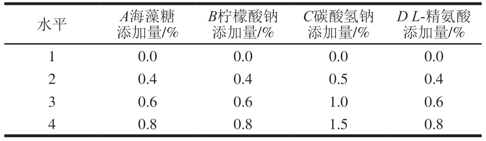 水平A海藻糖添加量/%D L-精氨酸添加量/%1 0.00.00.00.0 2 0.40.40.50.4 3 0.60.61.00.6 4 0.80.81.50.8 B柠檬酸钠添加量/%C碳酸氢钠添加量/%