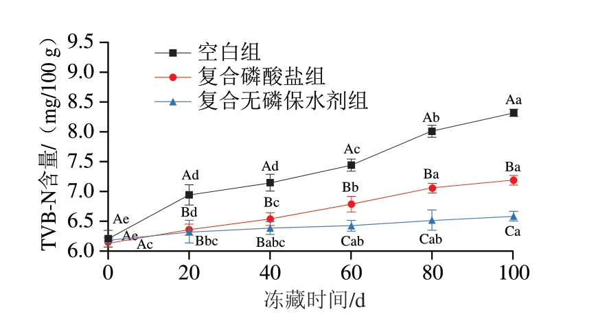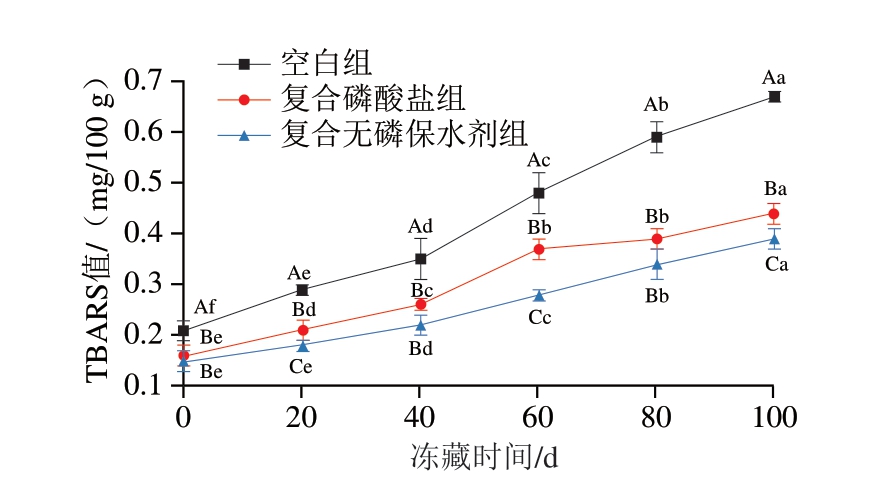 同一贮藏时间从左到右分别为空白组、复合磷酸盐组、复合无磷保水剂组。大写字母不同表示组间差异显著(P<0.05);小写字母不同表示组内差异显著(P<0.05);图4~8同。