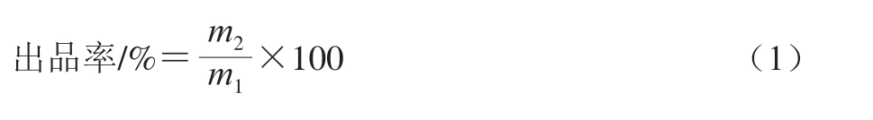 将鱼片用筛网沥干至无液体滴下,擦除残留水分后称质量并记录,出品率按式(1)计算: