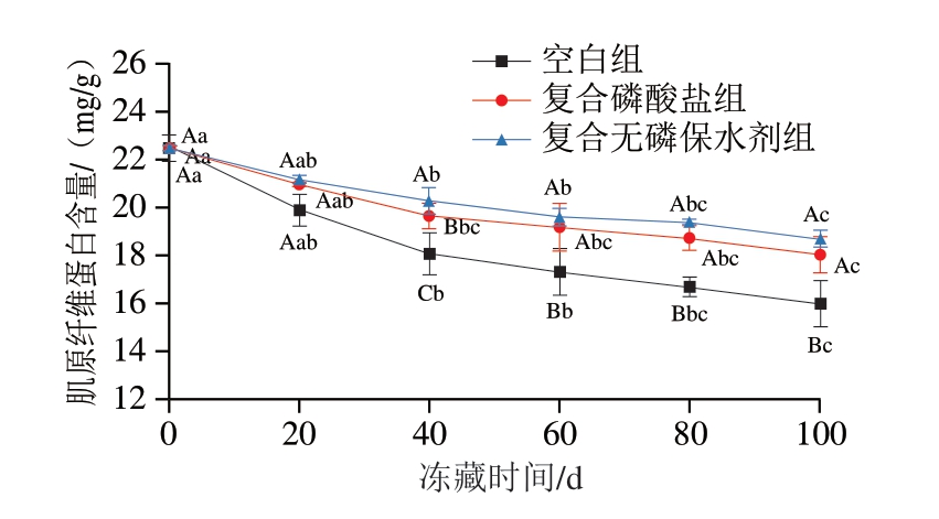 如图7所示,3 组样品的肌原纤维蛋白含量均随冻藏时间的延长呈下降趋势,在冻藏40 d后,空白组鱼片的肌原纤维蛋白含量与其他2 组差异显著(P<0.05)。冻藏100 d时,空白组、复合磷酸盐组和复合无磷保水剂组的肌原纤维蛋白含量较冻藏0 d时分别降低28.91%、19.73%和16.75%,原因可能是肌原纤维蛋白分子变性[33],导致一些不溶性蛋白被释放,最终引起蛋白质溶解性和凝胶特性下降[34-35];其次是黑鱼片在冻藏过程中,由于肌肉的氧化作用导致鱼肉中的蛋白质变性。其中复合无磷保水剂组黑鱼片冻藏100 d的肌原纤维蛋白含量分别比空白组和复合磷酸盐组高14.61%和3.58%。在不同处理组中,空白组的肌原纤维蛋白变性最为严重,其次是复合磷酸盐组和复合无磷保水剂组。因此可以得出,复合无磷保水剂在减少黑鱼片冻藏过程中肌原纤维蛋白损失方面具有更优的效果。