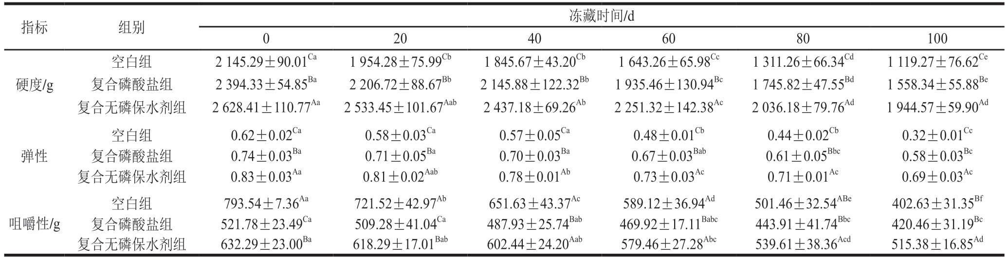 指标组别冻藏时间/d 0 20406080100硬度/g空白组2 145.29±90.01Ca1 954.28±75.99Cb1 845.67±43.20Cb1 643.26±65.98Cc1 311.26±66.34Cd1 119.27±76.62Ce复合磷酸盐组2 394.33±54.85Ba2 206.72±88.67Bb2 145.88±122.32Bb1 935.46±130.94Bc1 745.82±47.55Bd1 558.34±55.88Be复合无磷保水剂组2 628.41±110.77Aa2 533.45±101.67Aab2 437.18±69.26Ab2 251.32±142.38Ac2 036.18±79.76Ad1 944.57±59.90Ad弹性空白组0.62±0.02Ca0.58±0.03Ca0.57±0.05Ca0.48±0.01Cb0.44±0.02Cb0.32±0.01Cc复合磷酸盐组0.74±0.03Ba0.71±0.05Ba0.70±0.03Ba0.67±0.03Bab0.61±0.05Bbc0.58±0.03Bc复合无磷保水剂组0.83±0.03Aa0.81±0.02Aab0.78±0.01Ab0.73±0.03Ac0.71±0.01Ac0.69±0.03Ac咀嚼性/g空白组793.54±7.36Aa721.52±42.97Ab651.63±43.37Ac589.12±36.94Ad501.46±32.54ABe402.63±31.35Bf复合磷酸盐组521.78±23.49Ca509.28±41.04Ca487.93±25.74Bab469.92±17.11Babc443.91±41.74Bbc420.46±31.19Bc复合无磷保水剂组632.29±23.00Ba618.29±17.01Bab602.44±24.20Aab579.46±27.28Abc539.61±38.36Acd515.38±16.85Ad