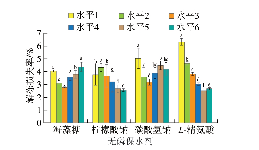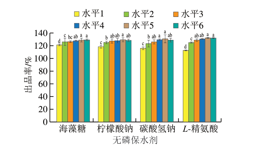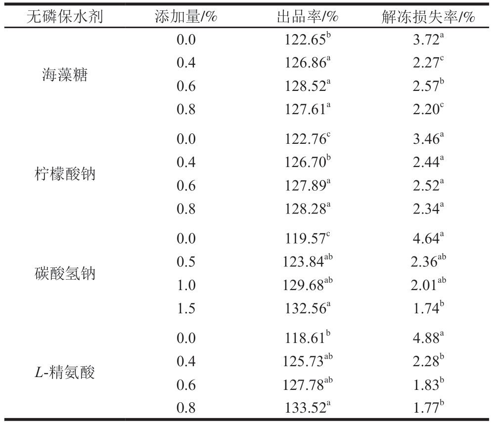 以出品率和解冻损失率为指标,根据预实验结果,以海藻糖、柠檬酸钠、碳酸氢钠和L-精氨酸4 种保水剂添加量为因素设计单因素试验(表1)。
