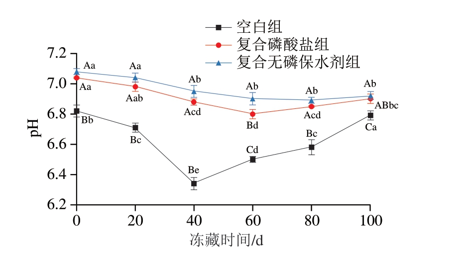 图4 复合无磷保水剂对冷冻期间调理黑鱼片pH值的影响