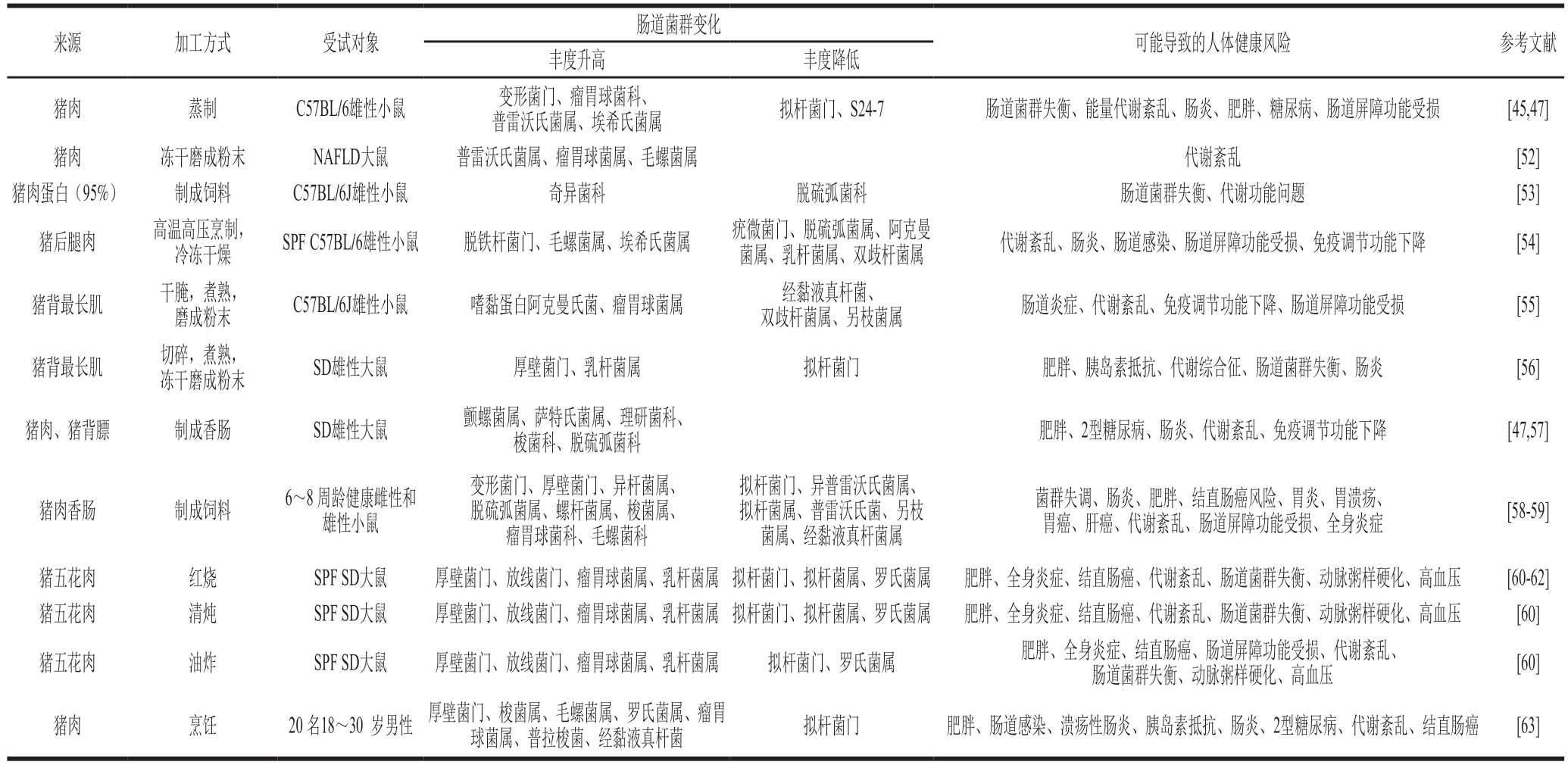 肠道菌群变化来源加工方式受试对象可能导致的人体健康风险参考文献丰度升高丰度降低猪肉蒸制C57BL/6雄性小鼠变形菌门、瘤胃球菌科、普雷沃氏菌属、埃希氏菌属拟杆菌门、S24-7肠道菌群失衡、能量代谢紊乱、肠炎、肥胖、糖尿病、肠道屏障功能受损[45,47]猪肉冻干磨成粉末NAFLD大鼠普雷沃氏菌属、瘤胃球菌属、毛螺菌属代谢紊乱[52]猪肉蛋白(95%)制成饲料C57BL/6J雄性小鼠奇异菌科脱硫弧菌科肠道菌群失衡、代谢功能问题[53]猪后腿肉高温高压烹制,冷冻干燥SPF C57BL/6雄性小鼠脱铁杆菌门、毛螺菌属、埃希氏菌属疣微菌门、脱硫弧菌属、阿克曼菌属、乳杆菌属、双歧杆菌属代谢紊乱、肠炎、肠道感染、肠道屏障功能受损、免疫调节功能下降[54]猪背最长肌干腌,煮熟,磨成粉末C57BL/6J雄性小鼠嗜黏蛋白阿克曼氏菌、瘤胃球菌属经黏液真杆菌、双歧杆菌属、另枝菌属肠道炎症、代谢紊乱、免疫调节功能下降、肠道屏障功能受损[55]猪背最长肌切碎,煮熟,冻干磨成粉末SD雄性大鼠厚壁菌门、乳杆菌属拟杆菌门肥胖、胰岛素抵抗、代谢综合征、肠道菌群失衡、肠炎[56]猪肉、猪背膘制成香肠SD雄性大鼠颤螺菌属、萨特氏菌属、理研菌科、梭菌科、脱硫弧菌科肥胖、2型糖尿病、肠炎、代谢紊乱、免疫调节功能下降[47,57]猪肉香肠制成饲料6~8 周龄健康雌性和雄性小鼠变形菌门、厚壁菌门、异杆菌属、脱硫弧菌属、螺杆菌属、梭菌属、瘤胃球菌科、毛螺菌科拟杆菌门、异普雷沃氏菌属、拟杆菌属、普雷沃氏菌、另枝菌属、经黏液真杆菌属菌群失调、肠炎、肥胖、结直肠癌风险、胃炎、胃溃疡、胃癌、肝癌、代谢紊乱、肠道屏障功能受损、全身炎症[58-59]猪五花肉红烧SPF SD大鼠厚壁菌门、放线菌门、瘤胃球菌属、乳杆菌属拟杆菌门、拟杆菌属、罗氏菌属肥胖、全身炎症、结直肠癌、代谢紊乱、肠道菌群失衡、动脉粥样硬化、高血压[60-62]猪五花肉清炖SPF SD大鼠厚壁菌门、放线菌门、瘤胃球菌属、乳杆菌属拟杆菌门、拟杆菌属、罗氏菌属肥胖、全身炎症、结直肠癌、代谢紊乱、肠道菌群失衡、动脉粥样硬化、高血压[60]猪五花肉油炸SPF SD大鼠厚壁菌门、放线菌门、瘤胃球菌属、乳杆菌属拟杆菌门、罗氏菌属肥胖、全身炎症、结直肠癌、肠道屏障功能受损、代谢紊乱、肠道菌群失衡、动脉粥样硬化、高血压[60]猪肉烹饪20 名18~30 岁男性厚壁菌门、梭菌属、毛螺菌属、罗氏菌属、瘤胃球菌属、普拉梭菌、经黏液真杆菌拟杆菌门肥胖、肠道感染、溃疡性肠炎、胰岛素抵抗、肠炎、2型糖尿病、代谢紊乱、结直肠癌[63]
