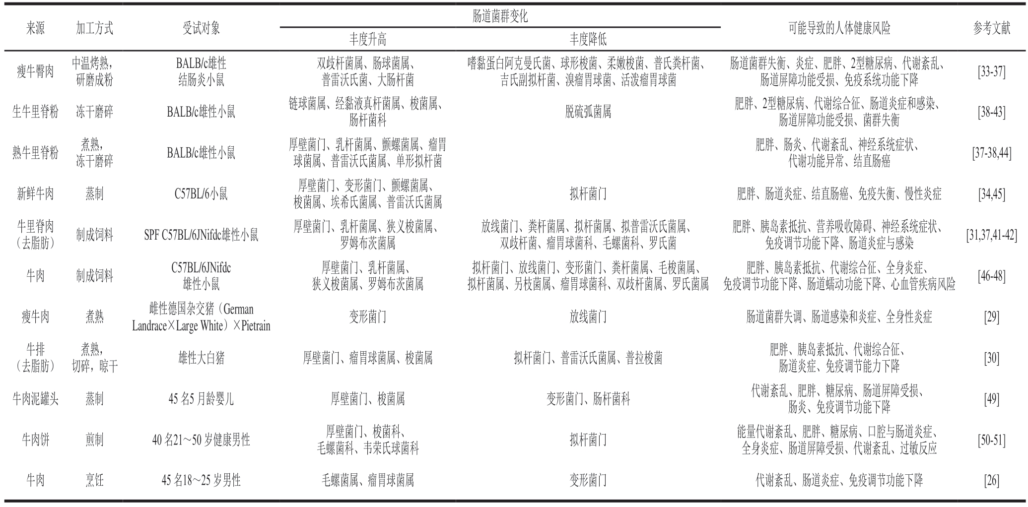 肠道菌群变化来源加工方式受试对象可能导致的人体健康风险参考文献丰度升高丰度降低瘦牛臀肉中温烤熟,研磨成粉BALB/c雄性结肠炎小鼠双歧杆菌属、肠球菌属、普雷沃氏菌、大肠杆菌嗜黏蛋白阿克曼氏菌、球形梭菌、柔嫩梭菌、普氏粪杆菌、吉氏副拟杆菌、溴瘤胃球菌、活泼瘤胃球菌肠道菌群失衡、炎症、肥胖、2型糖尿病、代谢紊乱、肠道屏障功能受损、免疫系统功能下降[33-37]生牛里脊粉冻干磨碎BALB/c雄性小鼠链球菌属、经黏液真杆菌属、梭菌属、肠杆菌科脱硫弧菌属肥胖、2型糖尿病、代谢综合征、肠道炎症和感染、肠道屏障功能受损、菌群失衡[38-43]熟牛里脊粉煮熟,冻干磨碎BALB/c雄性小鼠厚壁菌门、乳杆菌属、颤螺菌属、瘤胃球菌属、普雷沃氏菌属、单形拟杆菌肥胖、肠炎、代谢紊乱、神经系统症状、代谢功能异常、结直肠癌[37-38,44]新鲜牛肉蒸制C57BL/6小鼠厚壁菌门、变形菌门、颤螺菌属、梭菌属、埃希氏菌属、普雷沃氏菌属拟杆菌门肥胖、肠道炎症、结直肠癌、免疫失衡、慢性炎症[34,45](去脂肪)制成饲料SPF C57BL/6JNifdc雄性小鼠厚壁菌门、乳杆菌属、狭义梭菌属、罗姆布茨菌属牛里脊肉放线菌门、粪杆菌属、拟杆菌属、拟普雷沃氏菌属、双歧杆菌、瘤胃球菌科、毛螺菌科、罗氏菌肥胖、胰岛素抵抗、营养吸收障碍、神经系统症状、免疫调节功能下降、肠道炎症与感染[31,37,41-42]牛肉制成饲料C57BL/6JNifdc雄性小鼠厚壁菌门、乳杆菌属、狭义梭菌属、罗姆布茨菌属拟杆菌门、放线菌门、变形菌门、粪杆菌属、毛梭菌属、拟杆菌属、另枝菌属、瘤胃球菌科、双歧杆菌属、罗氏菌属肥胖、胰岛素抵抗、代谢综合征、全身炎症、免疫调节功能下降、肠道蠕动功能下降、心血管疾病风险[46-48]瘦牛肉煮熟雌性德国杂交猪(German Landrace×Large White)×Pietrain变形菌门放线菌门肠道菌群失调、肠道感染和炎症、全身性炎症[29]牛排(去脂肪)切碎,晾干雄性大白猪厚壁菌门、瘤胃球菌属、梭菌属拟杆菌门、普雷沃氏菌属、普拉梭菌肥胖、胰岛素抵抗、代谢综合征、肠道炎症、免疫调节能力下降[30]煮熟,牛肉泥罐头蒸制45 名5 月龄婴儿厚壁菌门、梭菌属变形菌门、肠杆菌科代谢紊乱、肥胖、糖尿病、肠道屏障受损、肠炎、免疫调节功能下降[49]牛肉饼煎制40 名21~50 岁健康男性厚壁菌门、梭菌科、毛螺菌科、韦荣氏球菌科拟杆菌门能量代谢紊乱、肥胖、糖尿病、口腔与肠道炎症、全身炎症、肠道屏障受损、代谢紊乱、过敏反应[50-51]牛肉烹饪45 名18~25 岁男性毛螺菌属、瘤胃球菌属变形菌门代谢紊乱、肠道炎症、免疫调节功能下降[26]