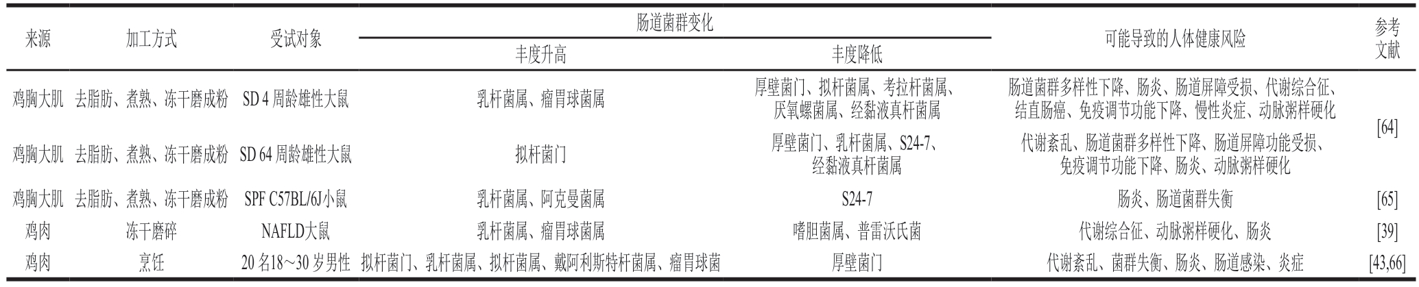 肠道菌群变化来源加工方式受试对象可能导致的人体健康风险参考文献丰度升高丰度降低肠道菌群多样性下降、肠炎、肠道屏障受损、代谢综合征、结直肠癌、免疫调节功能下降、慢性炎症、动脉粥样硬化[64]鸡胸大肌去脂肪、煮熟、冻干磨成粉SD 64 周龄雄性大鼠拟杆菌门厚壁菌门、乳杆菌属、S24-7、经黏液真杆菌属鸡胸大肌去脂肪、煮熟、冻干磨成粉SD 4 周龄雄性大鼠乳杆菌属、瘤胃球菌属厚壁菌门、拟杆菌属、考拉杆菌属、厌氧螺菌属、经黏液真杆菌属代谢紊乱、肠道菌群多样性下降、肠道屏障功能受损、免疫调节功能下降、肠炎、动脉粥样硬化鸡胸大肌去脂肪、煮熟、冻干磨成粉SPF C57BL/6J小鼠乳杆菌属、阿克曼菌属S24-7肠炎、肠道菌群失衡[65]鸡肉冻干磨碎NAFLD大鼠乳杆菌属、瘤胃球菌属嗜胆菌属、普雷沃氏菌代谢综合征、动脉粥样硬化、肠炎[39]鸡肉烹饪20 名18~30 岁男性拟杆菌门、乳杆菌属、拟杆菌属、戴阿利斯特杆菌属、瘤胃球菌厚壁菌门代谢紊乱、菌群失衡、肠炎、肠道感染、炎症[43,66]