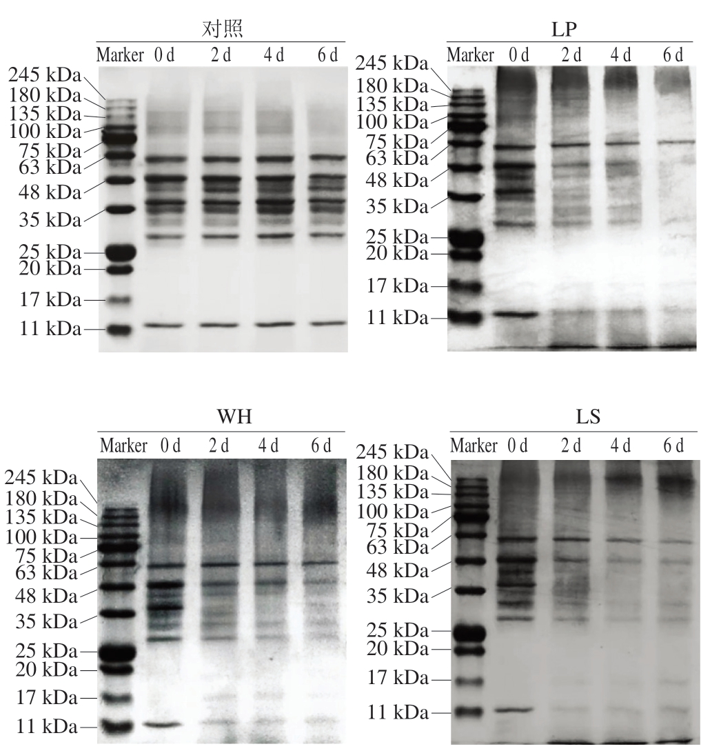 蛋白质降解可以提高发酵肉制品的风味和营养价值,通常受肌肉组织中的内源性蛋白酶和参与发酵的微生物产生的蛋白酶的影响[23]。由图2可知,随着发酵的进行,对照组蛋白条带几乎不变,表明内源性蛋白酶在这个过程中对蛋白质的降解作用很小[4];而接种组蛋白条带逐渐变浅并出现新的蛋白条带,表明蛋白质降解主要由乳酸菌蛋白酶引起[24]。发酵2 d后,接种组11 kDa处的条带、25~63 kDa间的条带明显变浅,17 kDa处出现蛋白条带,表明3 种乳酸菌均有较强的蛋白质降解能力;相较于其他处理组,在发酵6 d后,LP处理组中25~48、63~100 kDa范围内的条带基本消失,这表明植物乳植杆菌对蛋白质的降解能力最强。