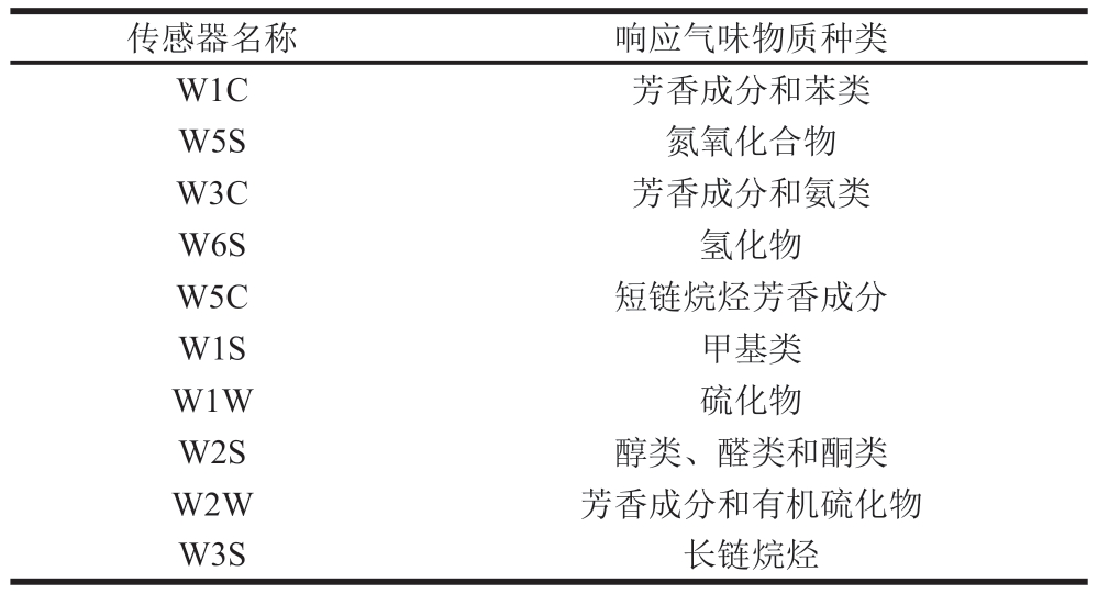 传感器名称响应气味物质种类W1C芳香成分和苯类W5S氮氧化合物W3C芳香成分和氨类W6S氢化物W5C短链烷烃芳香成分W1S甲基类W1W硫化物W2S醇类、醛类和酮类W2W芳香成分和有机硫化物W3S长链烷烃