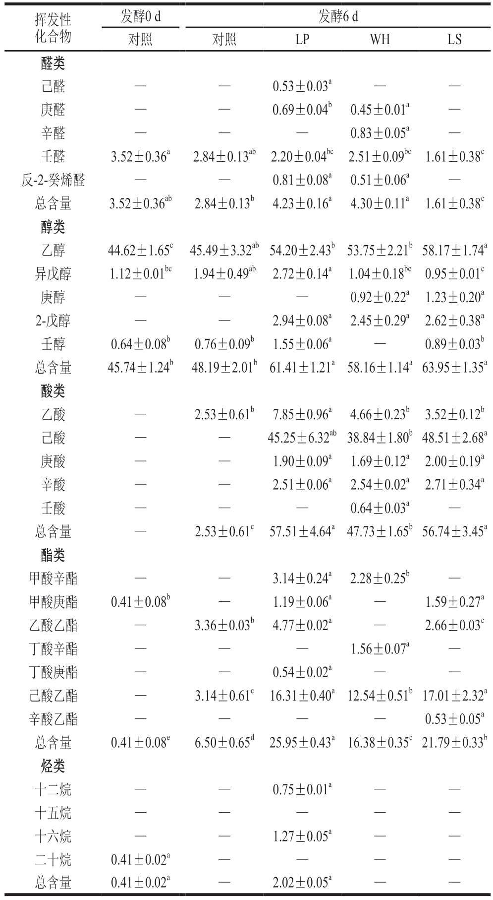 挥发性化合物发酵0 d发酵6 d对照对照LPWHLS醛类己醛——0.53±0.03a——庚醛——0.69±0.04b 0.45±0.01a—辛醛——0.83±0.05a—壬醛3.52±0.36a2.84±0.13ab 2.20±0.04bc 2.51±0.09bc 1.61±0.38c反-2-癸烯醛——0.81±0.08a 0.51±0.06a—总含量3.52±0.36ab2.84±0.13b 4.23±0.16a 4.30±0.11a 1.61±0.38c醇类乙醇44.62±1.65c 45.49±3.32ab 54.20±2.43b 53.75±2.21b 58.17±1.74a异戊醇1.12±0.01bc1.94±0.49ab 2.72±0.14a 1.04±0.18bc 0.95±0.01c庚醇——0.92±0.22a 1.23±0.20a 2-戊醇——2.94±0.08a 2.45±0.29a 2.62±0.38a壬醇0.64±0.08b0.76±0.09b 1.55±0.06a—0.89±0.03b总含量45.74±1.24b 48.19±2.01b 61.41±1.21a 58.16±1.14a 63.95±1.35a酸类乙酸—2.53±0.61b 7.85±0.96a 4.66±0.23b 3.52±0.12b己酸——45.25±6.32ab 38.84±1.80b 48.51±2.68a庚酸——1.90±0.09a 1.69±0.12a 2.00±0.19a辛酸——2.51±0.06a 2.54±0.02a 2.71±0.34a壬酸——0.64±0.03a—总含量—2.53±0.61c 57.51±4.64a 47.73±1.65b 56.74±3.45a酯类甲酸辛酯——3.14±0.24a 2.28±0.25b—甲酸庚酯0.41±0.08b—1.19±0.06a—1.59±0.27a乙酸乙酯—3.36±0.03b 4.77±0.02a—2.66±0.03c丁酸辛酯——1.56±0.07a—丁酸庚酯——0.54±0.02a——己酸乙酯—3.14±0.61c 16.31±0.40a 12.54±0.51b 17.01±2.32a辛酸乙酯——0.53±0.05a总含量0.41±0.08e6.50±0.65d 25.95±0.43a 16.38±0.35c 21.79±0.33b烃类十二烷——0.75±0.01a——十五烷——十六烷——1.27±0.05a——二十烷0.41±0.02a——总含量0.41±0.02a—2.02±0.05a——