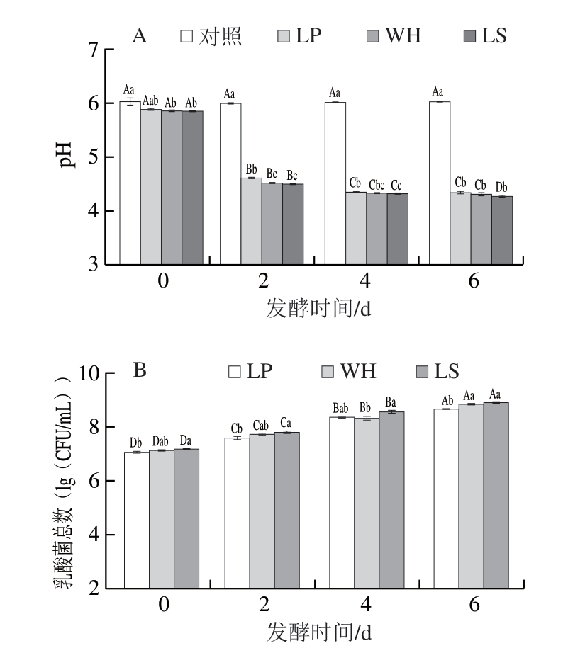 图1 接种不同乳酸菌的风干肠模拟体系发酵过程中pH值(A)和乳酸菌总数(B)的变化