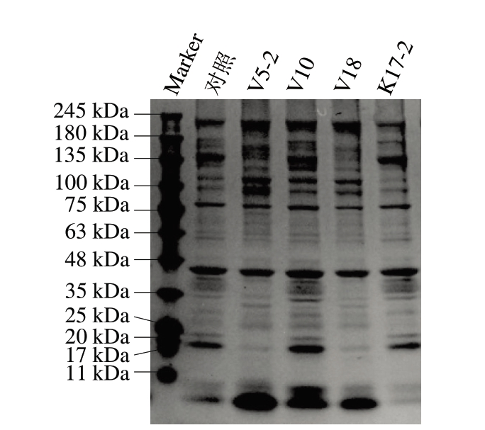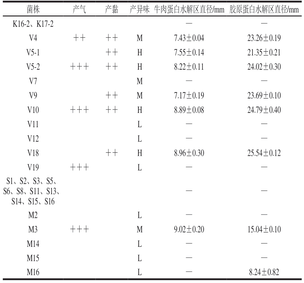 菌株产气产黏 产异味牛肉蛋白水解区直径/mm 胶原蛋白水解区直径/mm K16-2、K17-2——V4++++M7.43±0.0423.26±0.19 V5-1++H7.55±0.1421.35±0.21 V5-2+++++H8.22±0.1124.02±0.30 V7M——V9++M7.17±0.1923.69±0.10 V10+++++H8.89±0.0824.79±0.40 V11L——V12L——V18++H8.96±0.3025.54±0.12 V19+++L——S1、S2、S3、S5、S6、S8、S11、S13、S14、S15、S16——M2L——M3+++M9.02±0.2015.04±0.10 M14L——M15L——M16L—8.24±0.82