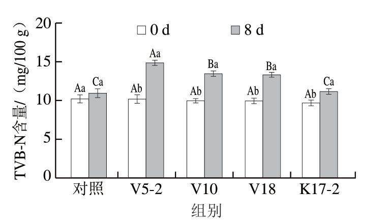 如图4所示,在牛肉糜贮藏开始时,对照组、V5-2、V10、V18、K17-2组的TVB-N含量分别为10.22、10.17、9.96、9.98、9.73 mg/100 g,且各组间差异不显著。贮藏第8天时,各组的TVB-N含量分别为10.95、14.90、13.49、13.31、11.18 mg/100 g,均小于15 mg/100 g的限值[36]。对照组贮藏第0、8天的TVB-N含量间差异不显著,4 个接菌组的TVB-N含量均显著升高(P<0.05),其中,K17-2组的TVB-N含量显著低于V5-2、V10、V18组(P<0.05)。结果表明,菌株V5-2、V10、V18及K17-2对牛肉蛋白质的降解作用产生胺、NH3等物质,进而致使TVB-N含量升高。TVB-N含量的升高与TVC的变化及pH值的波动呈现良好的对应关系。