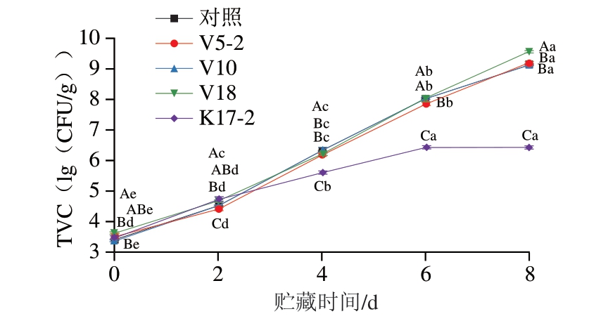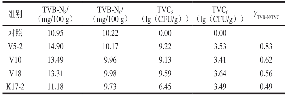 组别TVB-N8/(mg/100 g)TVB-N0/(mg/100 g)TVC8(lg(CFU/g))TVC0(lg(CFU/g)) YTVB-N/TVC对照10.9510.220.000.00 V5-214.9010.179.223.530.83 V1013.499.969.133.410.62 V1813.319.989.593.640.56 K17-211.189.736.453.490.49