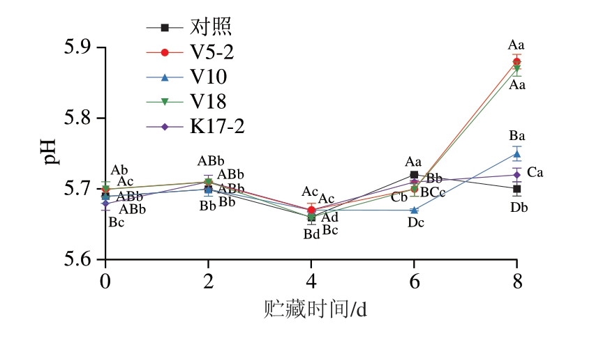 如图3所示,在牛肉糜贮藏开始时,对照组、V5-2、V10、V18、K17-2组的pH值分别为5.69、5.70、5.69、5.70、5.68。贮藏2 d时,各组的pH值无显著差异,贮藏2~4 d,各组的pH值均显著下降(P<0.05)。贮藏第4~6天,除V10组外,其余各组pH值均显著上升(P<0.05)。贮藏第6~8天,对照组pH值显著下降,4 个接菌组pH值显著上升(P<0.05)。贮藏第8天时,对照组、V5-2、V10、V18、K17-2组的pH值分别为5.70、5.88、5.75、5.87、5.72。对照组贮藏第0、8天的pH值之间无显著差异。微生物降解蛋白质会产生胺、NH3和碱性化合物,可能导致肉类贮藏时pH值上升[35]。贮藏第6~8天,V5-2、V10、V18组TVC快速增长,K17-2组TVC并无显著变化,这种差异很可能是造成V5-2、V10、V18组pH值大幅升高,而K17-2组pH值仅从5.71上升至5.72的原因。