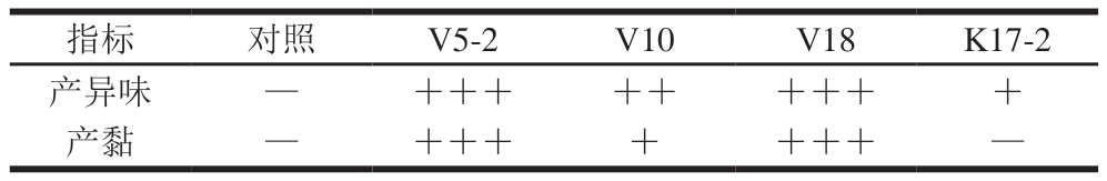 指标对照V5-2V10V18K17-2产异味—+++++++++产黏—+++++++—
