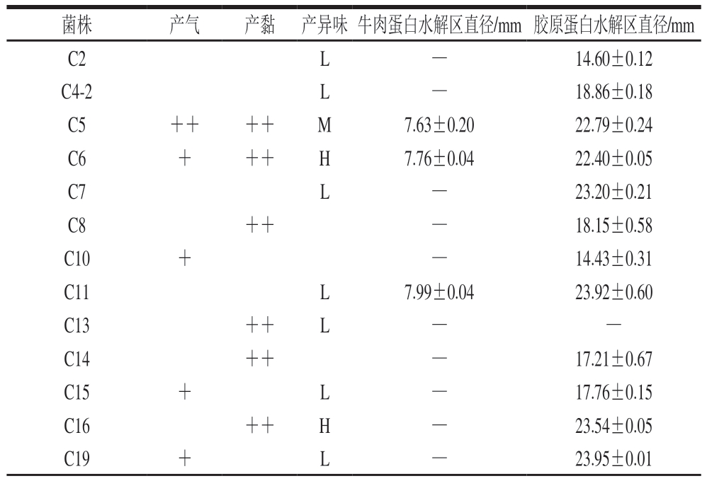 菌株产气产黏 产异味牛肉蛋白水解区直径/mm 胶原蛋白水解区直径/mm C2L—14.60±0.12 C4-2L—18.86±0.18 C5++++M7.63±0.2022.79±0.24 C6+++H7.76±0.0422.40±0.05 C7L—23.20±0.21 C8++—18.15±0.58 C10+—14.43±0.31 C11L7.99±0.0423.92±0.60 C13++L——C14++—17.21±0.67 C15+L—17.76±0.15 C16++H—23.54±0.05 C19+L—23.95±0.01