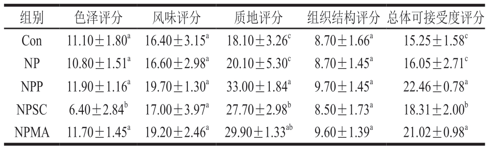 组别色泽评分风味评分质地评分组织结构评分总体可接受度评分Con11.10±1.80a 16.40±3.15a 18.10±3.26c8.70±1.66a15.25±1.58c NP10.80±1.51a 16.60±2.98a 20.10±5.30c8.70±1.45a16.05±2.71c NPP11.90±1.16a 19.70±1.30a 33.00±1.84a9.70±1.45a22.46±0.78a NPSC6.40±2.84b 17.00±3.97a 27.70±2.98b8.50±1.73a18.31±2.00b NPMA 11.70±1.45a 19.20±2.46a 29.90±1.33ab9.60±1.39a21.02±0.98a