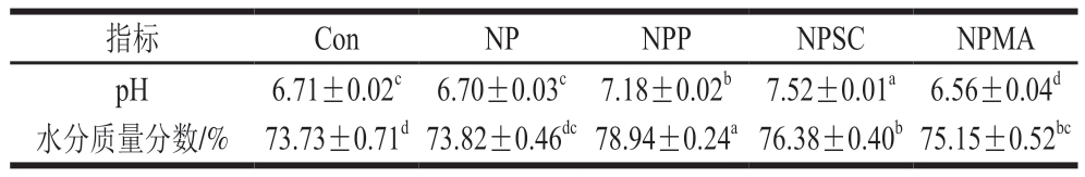 指标ConNPNPPNPSCNPMA pH6.71±0.02c 6.70±0.03c 7.18±0.02b 7.52±0.01a 6.56±0.04d水分质量分数/% 73.73±0.71d 73.82±0.46dc 78.94±0.24a 76.38±0.40b 75.15±0.52bc