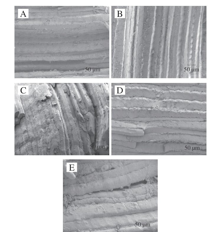 参照Ismail等[18]的方法并稍作修改。将待测样品切成约5 mm×4 mm×2 mm的肉块,用2.5%(V/V)戊二醛溶液在4 ℃下固定24 h(固定液按1∶20(g/mL)加入)。用0.1 mol/L磷酸缓冲液(pH 7.3)冲洗后,用蒸馏水冲洗,然后分别用体积分数30%、50%、70%、80%、90%的乙醇溶液进行梯度脱水,每个梯度3 次,每次10 min;随后用无水乙醇脱水2 次,每次1 h。将制备好的样品粘于导电胶上,喷金50 s,采用扫描电子显微镜,加速电压5 kV,放大(×200)观察。