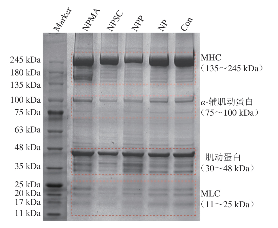 如图4所示,Con组与NP组的条带高度相似,表明针刺处理对肌肉蛋白未产生明显影响。除NP组外,其他处理组均对盐溶性蛋白的组成产生了一定影响,其中针刺+木瓜蛋白酶处理的效果最为显著,该处理提升了低分子质量蛋白(如肌球蛋白轻链(myosin light chain,MLC)、肌动蛋白等)的比例,而高分子质量蛋白(肌球蛋白重链(myosin heavy chain,MHC)等)占比明显降低,说明木瓜蛋白酶对肌动球蛋白具有较强的分解作用,形成较多肌动蛋白和MLC[32]。在NPSC组中,MHC区的条带相较于Con组和NP组较浅,但比NPP组深,同时小分子蛋白含量低于NPP组,这表明碳酸钠在降解大分子蛋白方面的能力不及木瓜蛋白酶。相较于NPP组,NPMA组情况与NPSC组相似,但其条带的颜色比NPSC组深,说明经针刺+碳酸钠处理后的牛肉干盐溶性蛋白损失较多,可能与pH值升高有关[33]。