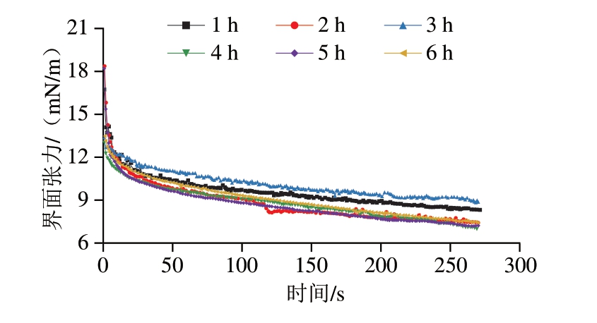 图6 不同炖煮时间鸡汤动态界面张力变化