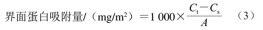 根据Hebishy等[16]的方法并稍作修改。将新鲜制备的鸡汤离心20 min(25 ℃、10 000×g),用注射器将下层水相缓慢吸出并通过滤膜(0.45 μm)以去除杂质。通过双缩脲法确定未吸附到界面上的蛋白质含量,标准蛋白为牛血清白蛋白[17]。界面蛋白吸附量按式(3)计算: