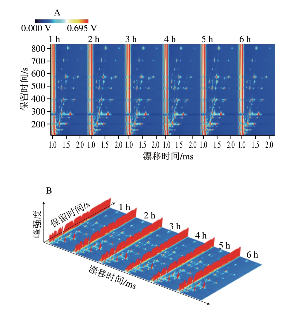 Fig.9 Two-dimensional (A) and three-dimensional GC-IMS spectra (B) of volatile compounds in chicken soup with different stewing times